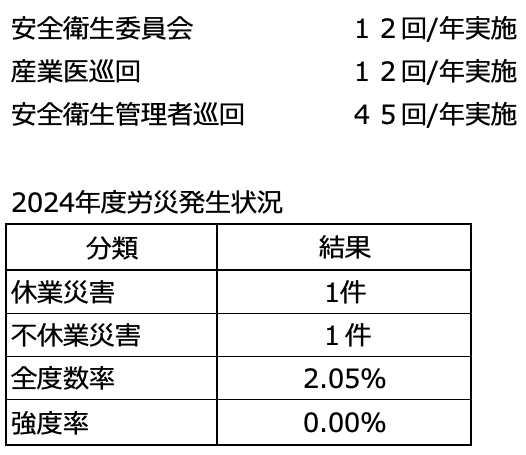 企業行動指針では、安全第一を常に考え、労働災害や職業病の未然防止と、事故や危険のない職場環境を