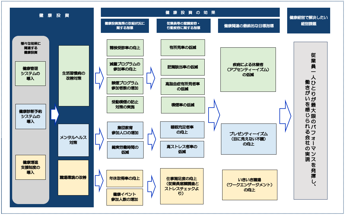 その実現には、経営方針・健康経営推進方針を一体化させ、社員の健康増進を図るとともに、働きがいのある職場づくりを進めることが重要です。